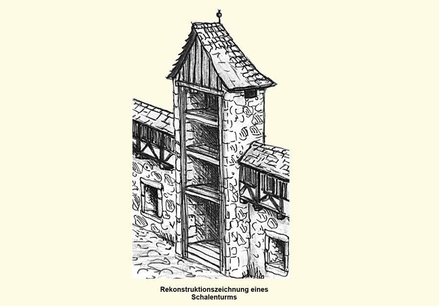 Mit dem vermehrten Einsatz von Feuerwaffen (Station 4) gegen Ende des 14. Jahrhunderts und dem Bau von Zwingeranlagen (Station 2) verstärkte man auch die äußere Ringmauer von Burgen. In diese wurden in regelmäßigen Abständen Flankierungstürme eingebaut. Wegen ihrer nach innen offenen Bauweise werden sie Schalentürme genannt, die nach außen aus der Mauer hervortreten. Sie ermöglichen vor der Mauer ein seitliches Streichfeuer und erhöhten dadurch die Verteidigungsfähigkeit der Burg.