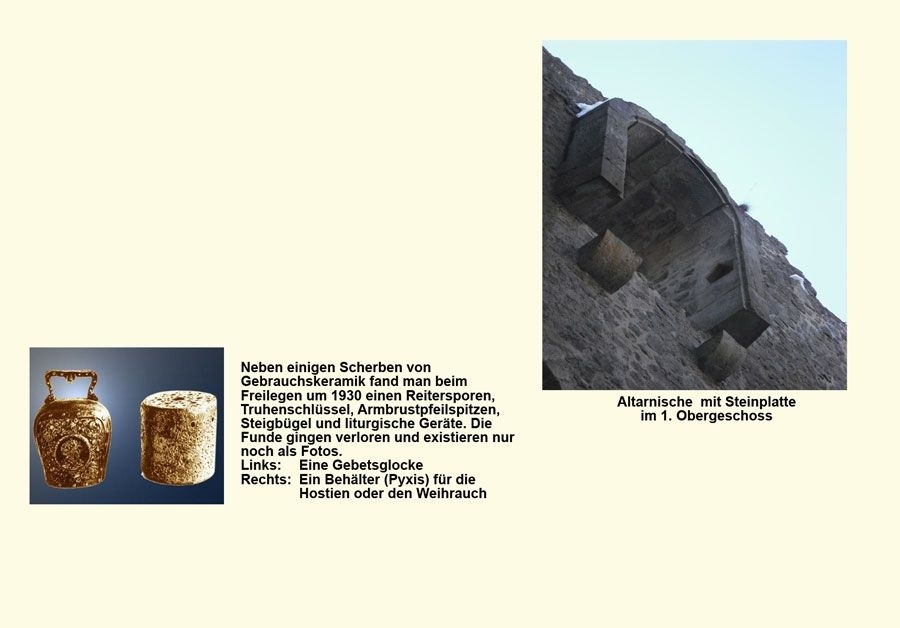 An der Ostwand des 1. Obergeschosses sind die Reste einer Hauskapelle in Form eines verschließbaren Wandschrankes zu sehen. Die gegenüberliegende Fensternische in der Westwand enthält wie im Wohnturm Reste eines Ausgusssteines (Station 6). Durch ihn konnte das anfallende Handwaschwasser bei liturgischen Handlungen und Festmahlen nach außen abfließen.