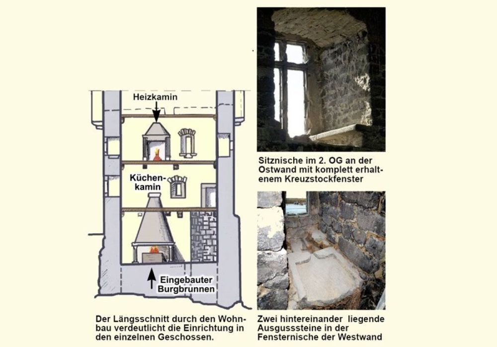 Im Erdgeschoss befand sich die Küche. Mauerreste der Abzugshaube des Küchenkamins sind in der Nordwand noch erkennbar. Der ca. 4m hohe, runde Turm in der Nordostecke wird als Brunnenturm gedeutet. Reste eines steinernen Türrahmens oberhalb des Turmes weisen auf einen Zugang zum Brunnen hin. Über eine an der Südwand angelegte Holztreppe waren die oberen Geschosse erreichbar, deren Holzdecken auf Konsolsteinen ruhten. Das 1. Obergeschoss verfügte über die Wohn- und Schlafräume. In der Südwand ist noch ein Zugang zum Aborterker erkennbar. Die Fenster waren ursprünglich alle mit Eisen vergittert.