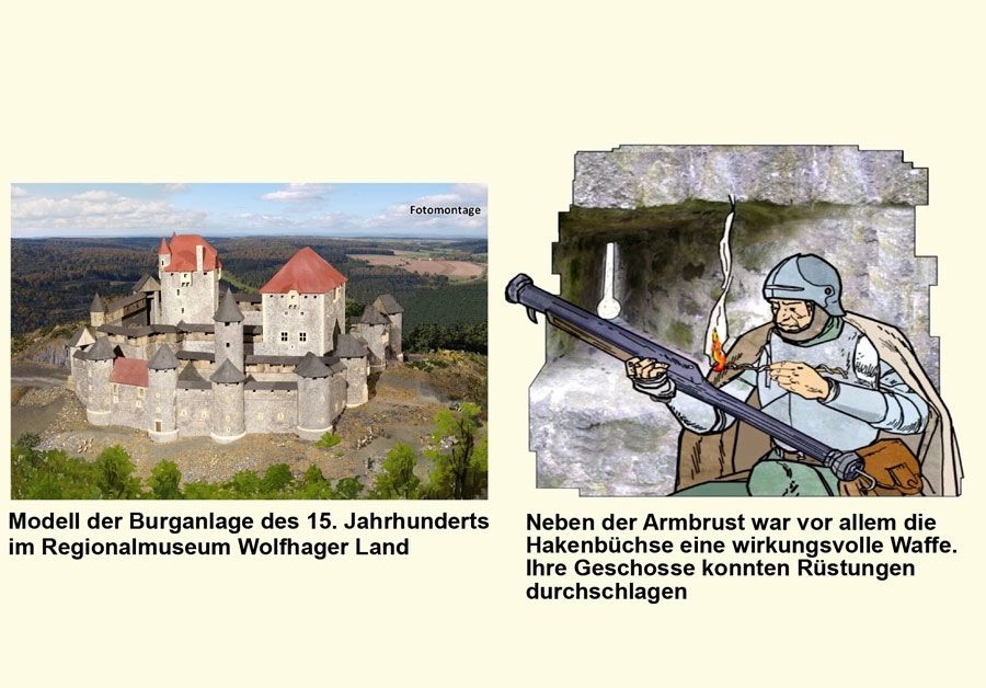konnte der Feind vor der Burg wirkungsvoll mit Hakenbüchsen beschossen werden. Hakenbüchsen waren einfache Handfeuerwaffen, die seit dem Ende des 14. Jahrhunderts zum Einsatz kamen. Der Haken an dem Rohrende der Büchse wurde hinter dem in der Schlüsselschießscharte eingeklemmten Prellholz oder hinter der Mauer „eingehakt“. Er ermöglichte genaues Zielen und verminderte den Rückstoß. Im Schalenturm der westlichen und nördlichen Ringmauer befanden sich Pforten für eine heimliche Flucht oder um einen in den Graben vorgedrungenen Feind zu bekämpfen. In unsicheren Zeiten waren die Haupttore verschlossen. Die Pforten dienten dann auch als Zu- und Ausgang.