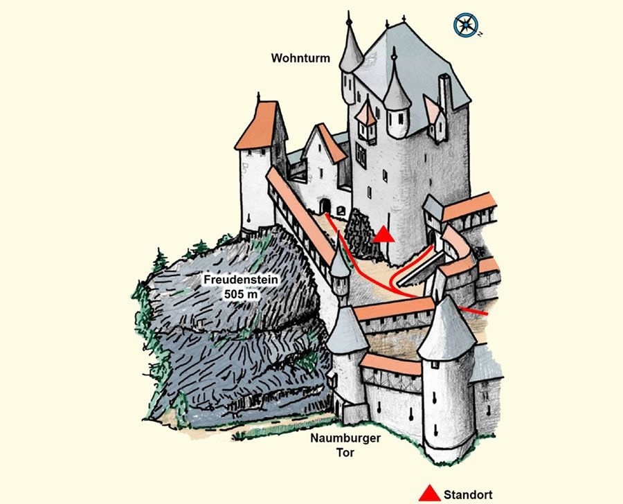Die Kernburg war an allen vier Seiten von „Zwingern“ umgeben. Hierbei handelte es sich um Korridore zwischen Türmen und Außenmauern, die freies Schussfeld für die Verteidigung schafften. Der Zwinger auf der Ostseite hatte ehemals auch die Funktion einer Vorburg. So stand z.B. an der Stelle des Informations- gebäudes ursprünglich ein Pferdestall. Dieser östliche Zwinger hatte drei Zu- bzw. Ausgänge (siehe rote Linien in der Zeichnung). Seine äußere Ringmauer enthält keine Schießscharten, da sie hier an einen vorgelagerten steilen Felsen, den Freudenstein, anlehnt.